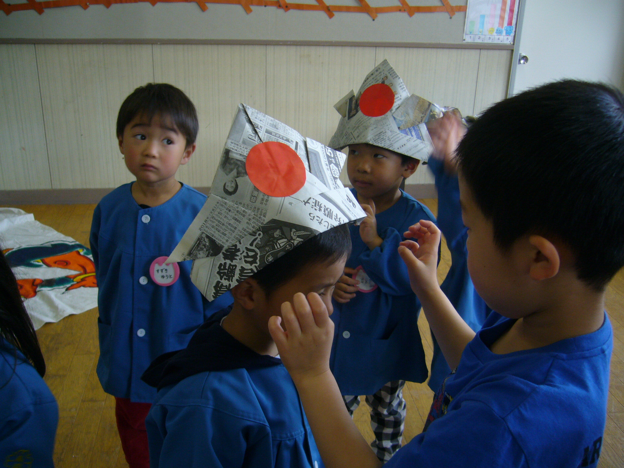 園長先生から、こいのぼり、しょうきさま、かしわもち、子どもの日についてなど、みんなが元気に大きくなるようにお願いする日と教えてもらいました。次に「こいのぼり」の歌を歌い、こいのぼりの中をくぐりぬけたりした後、かしわ餅をたべました。最後に年長組さんから、【かぶと】のプレゼントがありました。