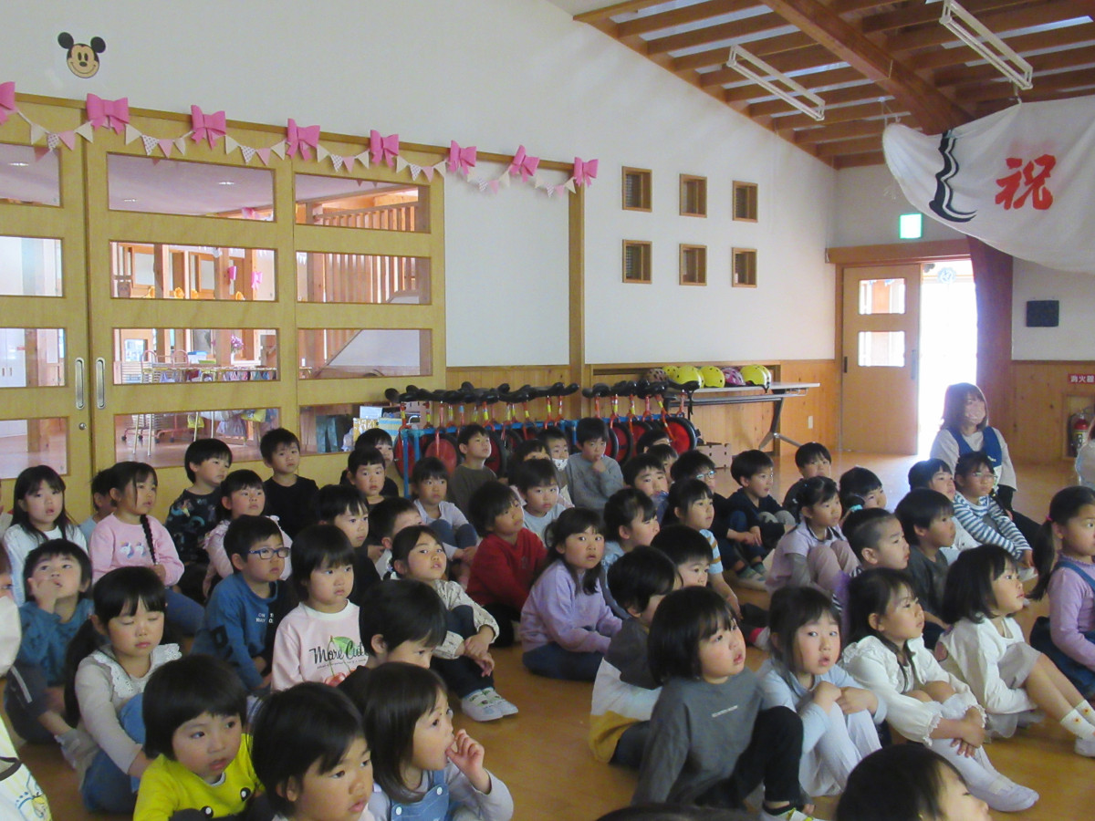 はじめに、全員が遊戯室に入り、年少組が発表会で発表したクラスごとの演技を観覧しました。🎵